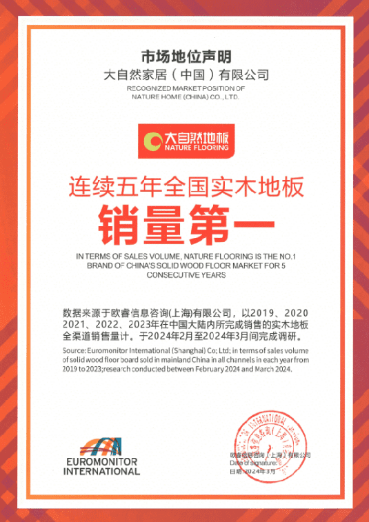 歐睿咨詢作為世界先進(jìn)的權(quán)威市場(chǎng)調(diào)查機(jī)構(gòu),所出示的調(diào)研數(shù)據(jù)具有行業(yè)認(rèn)可的公信力。據(jù)歐睿咨詢發(fā)布的數(shù)據(jù)顯示,大自然家居的實(shí)木地板在過(guò)去五年中一直保持著國(guó)內(nèi)市場(chǎng)的領(lǐng)先地位,穩(wěn)坐“全國(guó)實(shí)木地板銷量第一”寶座,展現(xiàn)出了強(qiáng)大的市場(chǎng)競(jìng)爭(zhēng)力和品牌影響力。