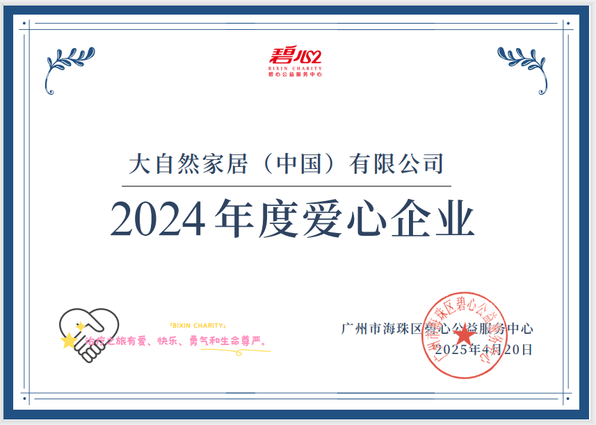 4月20日,大自然家居作為愛心典范企業(yè),受邀出席碧心公益主辦的“春天的回信——2025年度總結(jié)及答謝盛會”,并獲頒愛心企業(yè)感謝狀。這份殊榮,此殊榮,既是大自然家居多年來深耕公益領(lǐng)域的又一力證,亦將成為激勵大自然家居持續(xù)踐行“商業(yè)向善”理念的動力來源。